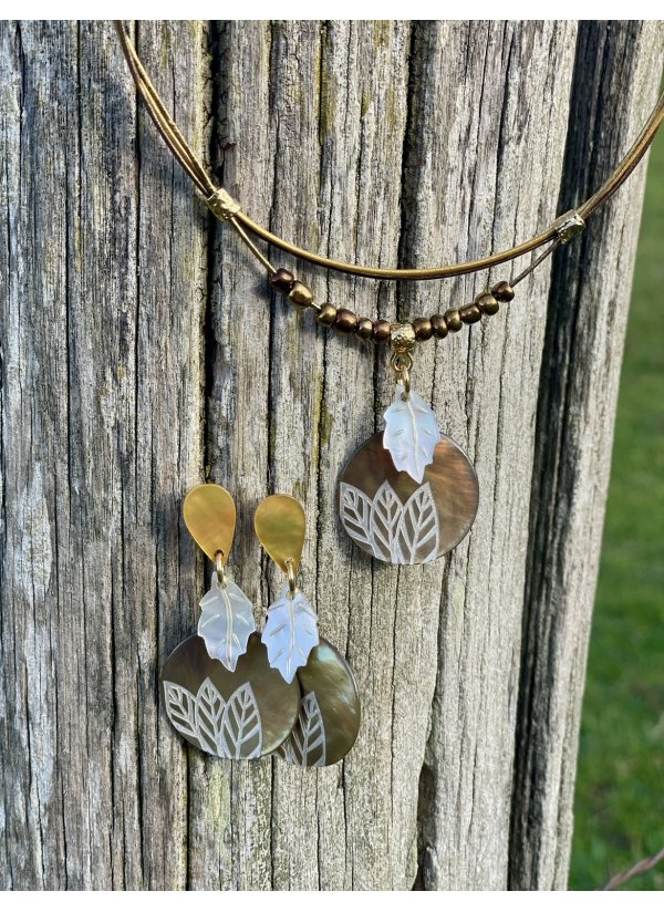 Boucles d'oreilles percées en nacre avec pastille diamètre 2,5cm rehaussée d'une feuille de nacre.