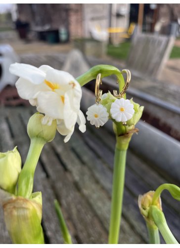 Boucles d'oreilles en acier inoxydable doré avec fleur marguerite en nacre.