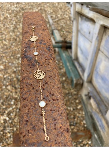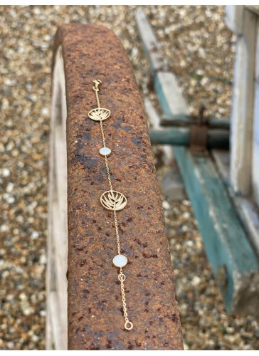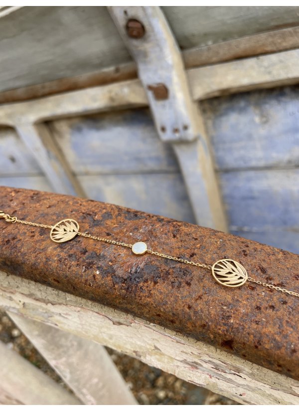 Bracelet en acier inoxydable avec pastilles feuille d'olivier 1,5cm et deux pastilles de nacre.