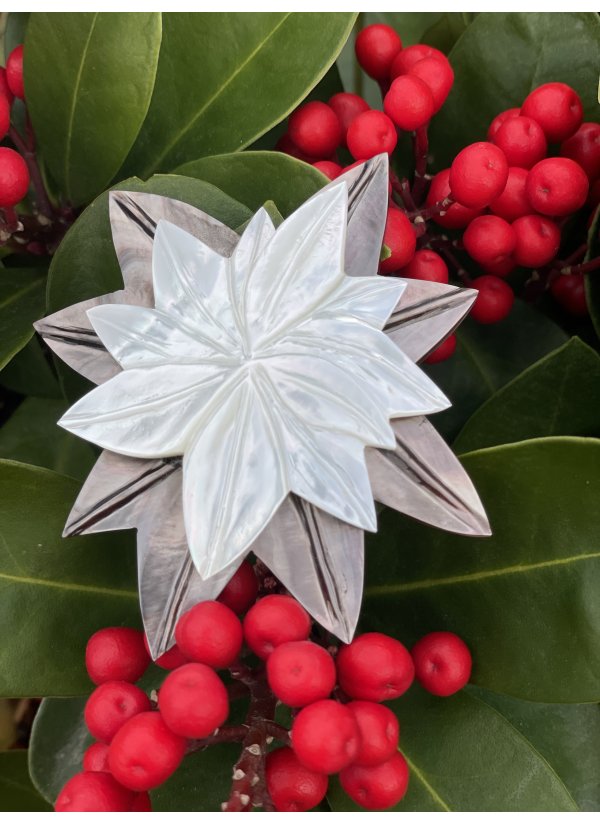 Broche entièrement en nacre blanche et grise.